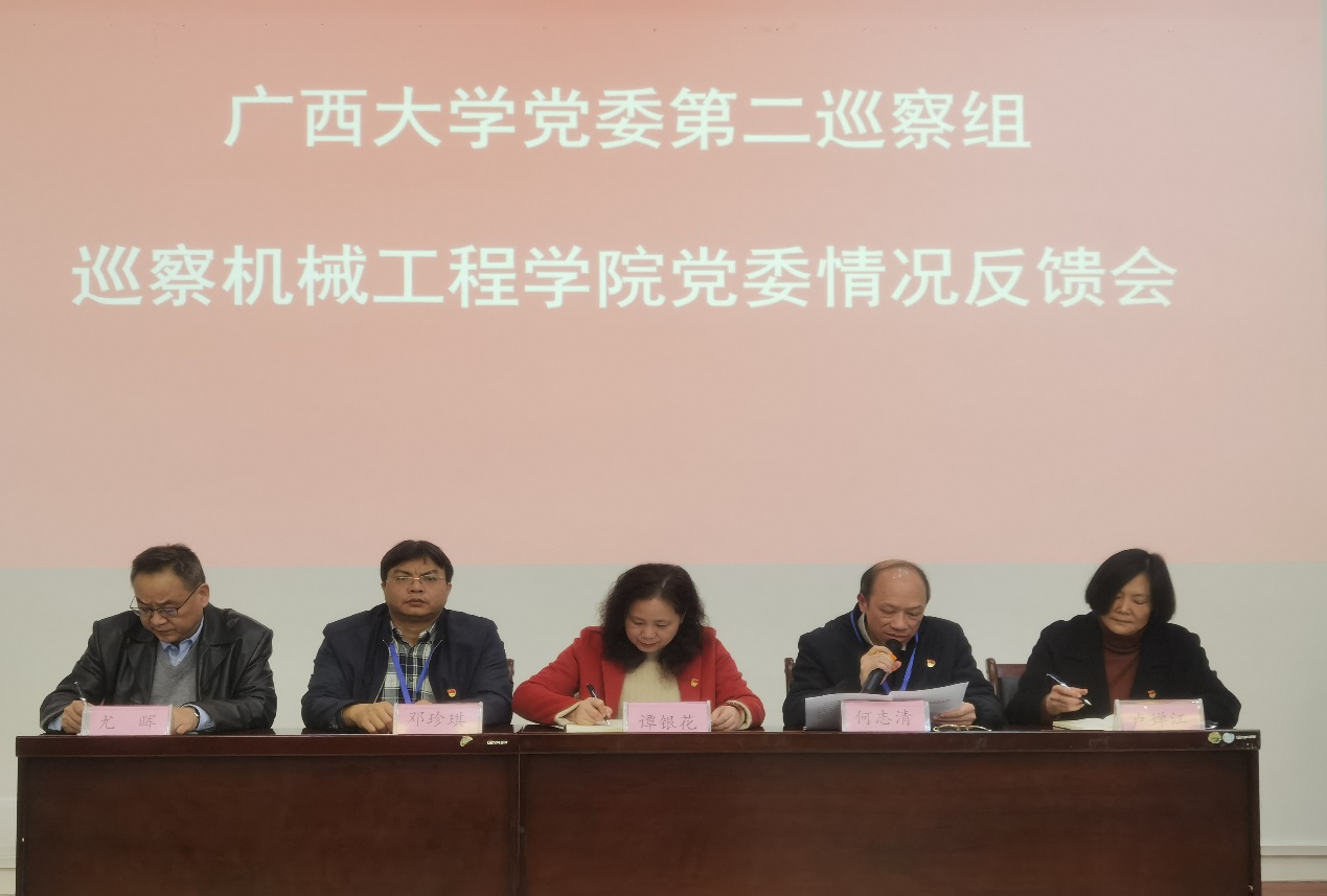 2022年1月4日下午,广西大学党委第二巡察组巡察古天乐代言太阳集团网址党委情况反馈会在机械楼机二阶会议室举行,出席会议的有校党委巡察工作领导小组成员代表、审计处处长谭银花同志,校党委第二巡察组长何志清同志,校党委第二巡察组副组长、计算机与电子信息学院党委副书记、纪委书记邓珍琪同志,古天乐代言太阳集团网址党委书记卢婵江同志,古天乐代言太阳集团网址院长尤晖同志。参加大会的有古天乐代言太阳集团网址全体教师和部分学生党员代表。大会由古天乐代言太阳集团网址纪委书记黄路明主持,大会共进行了三项议程。