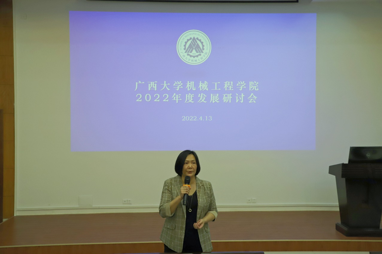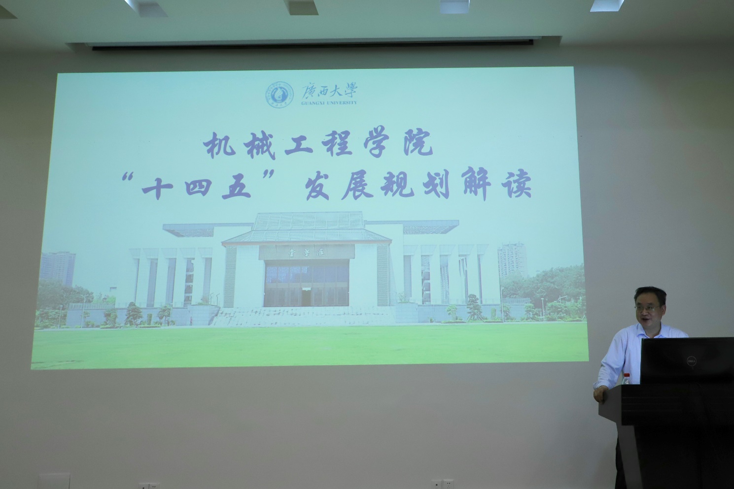 会议分为主题发言与交流讨论两个阶段。在主题发言阶段,院长尤晖向参会人员讲解学院“十四五”规划的内容和未来发展思路。他表示,经过前期大量调研、研讨,目前学院“十四五”规划已经提交学校等待审批。按照《广西大学“十四五”规划》的总体目标,以《加强“从0到1”基础研究工作方案》为契机,学院在“十四五”将坚持以改革求发展,以学科建设为龙头,以队伍建设为根本,以提高人才培养质量为基础,以科技创新为突破,进一步明确办学与发展思路,坚持特色,科学谋划,重点突破,全面提升学院学科层次、科研实力、人才培养质量和管理水平。尤院长全面分析了学院现在学科建设、教育教学、科学研究、师资队伍建设四个方面的成绩与短板,并结合形势、校情、院情对学院今后相关工作作出具体部署。他提出,学院的长远发展目标是到2028年,绝大部分教师进入新轨,机械工程学科评估达到B,在同类高校中学院成为具有较大影响力的人才培养和科学研究基地;到2035年,教师队伍全部实现并轨进入新轨发展,机械工程学科评估达到A-,学院成为具有重大国内影响的人才培养和科学研究基地。