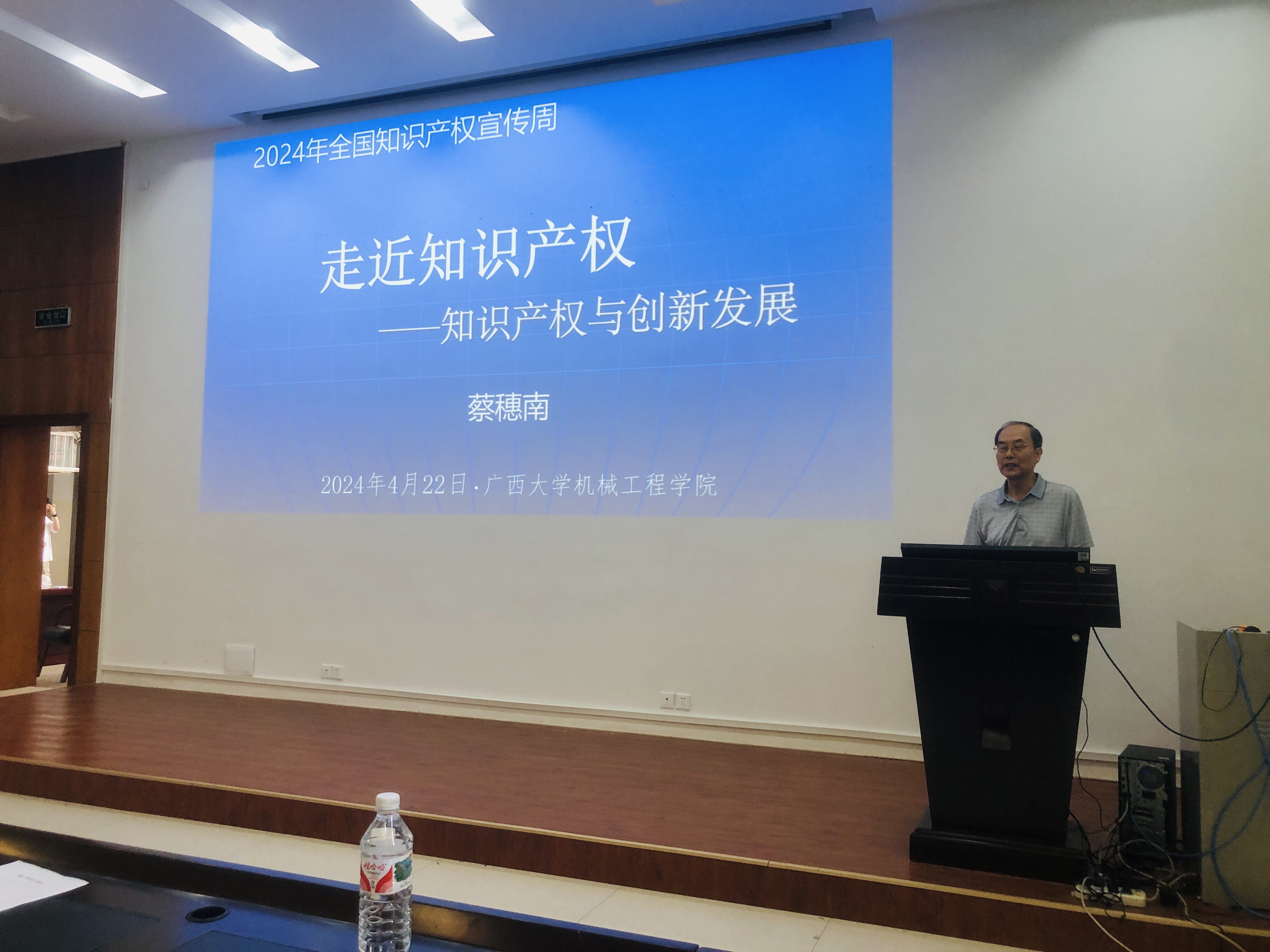4月22-26日是我国第十六个全国知识产权宣传周,也是世界知识产权日。为深入贯彻落实党中央、国务院关于大力推进专利产业化的决策部署,加速古天乐代言太阳集团网址高价值专利的转化,推动古天乐代言太阳集团网址与企业和科研机构的专利转化,古天乐代言太阳集团网址于4月26日邀请原自治区政府知识产权办公室副主任、广西知识产权局综合管理处处长蔡穂南给学院师生作“走近知识产权——知识产权与创新发展”报告。