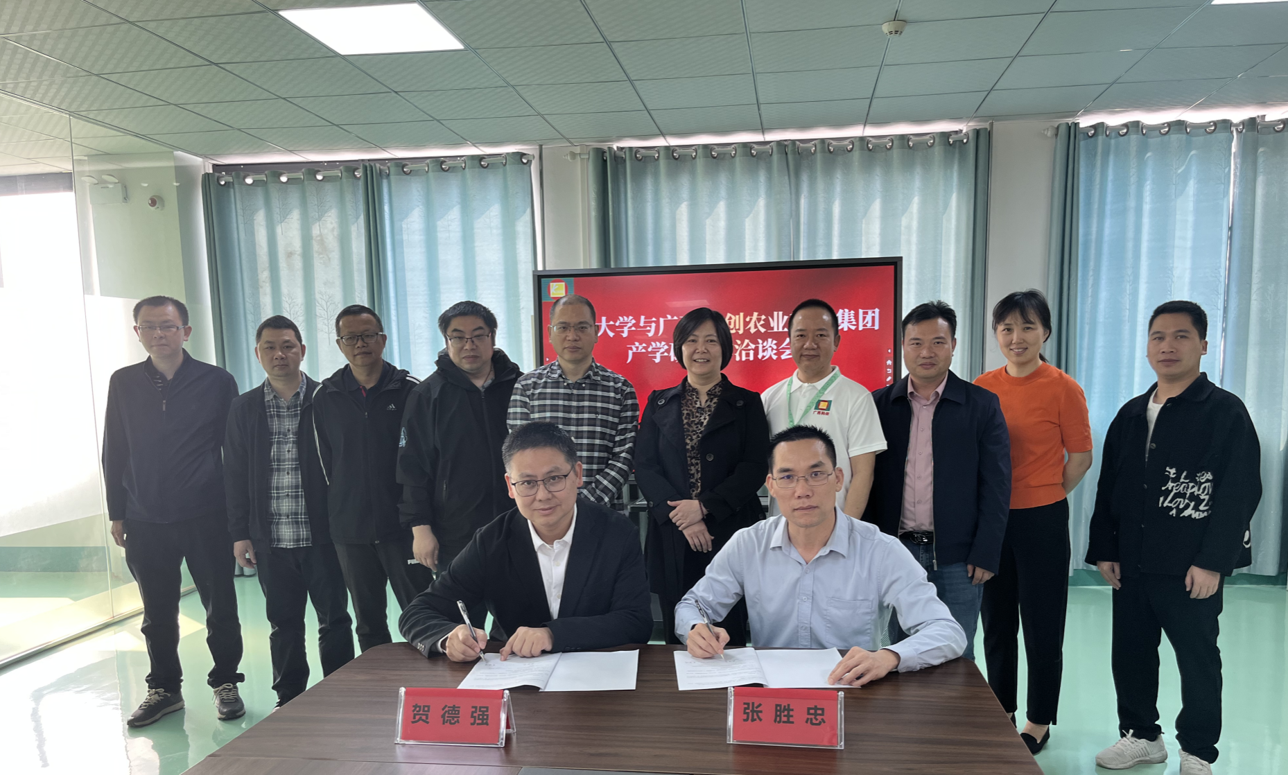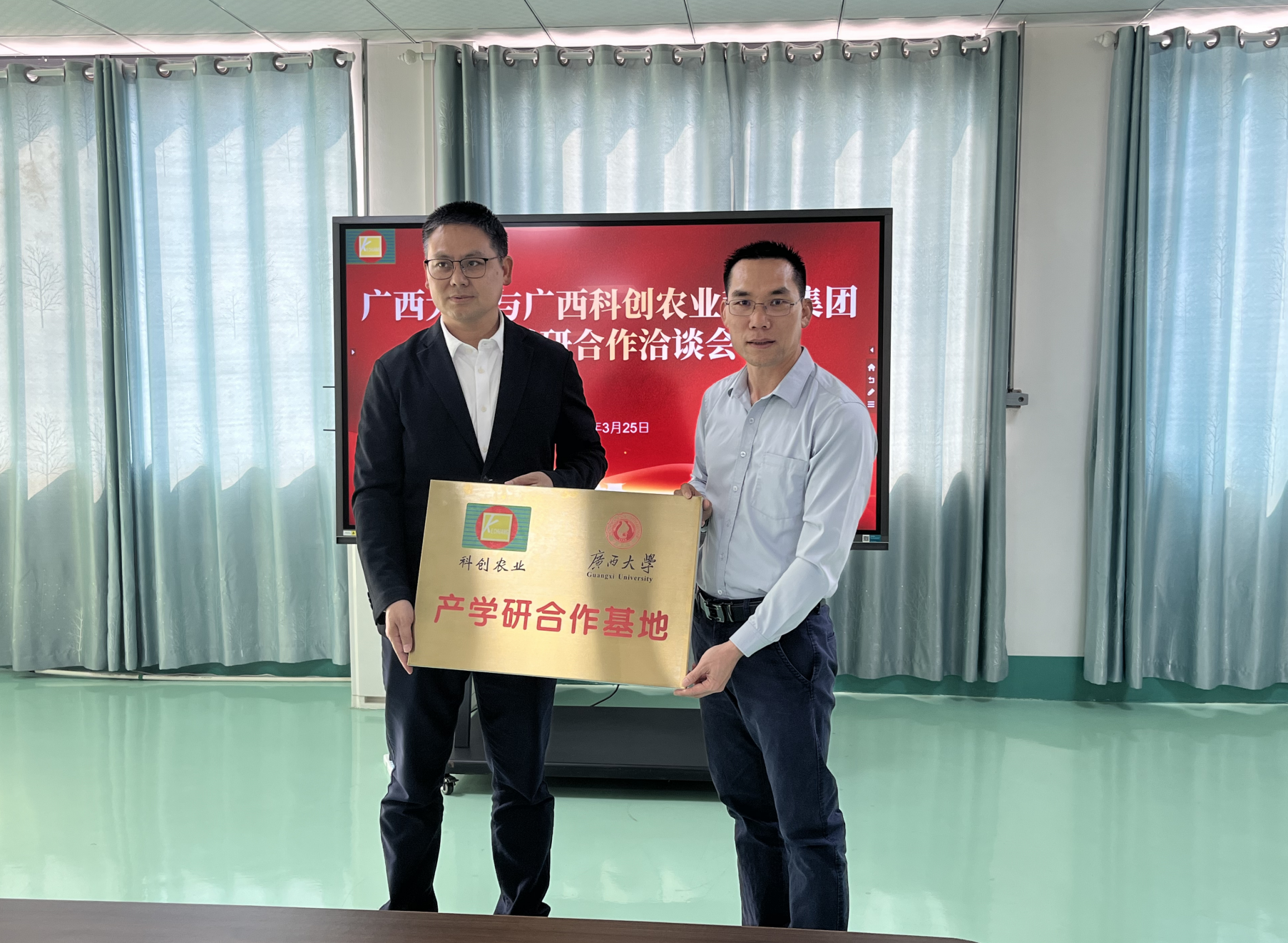 最后,贺德强院长代表西大和张胜忠董事长签署“广西大学-广西科创农业科技集团产学研合作基地”共建协议,并现场举行揭牌仪式。